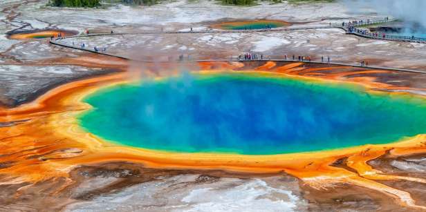 Did you know that 60% of the world’s hot springs and geysers are inside Yellowstone? That’s how many there are. The most photographed thermal feature in the park is the Grand Prismatic Hot Spring. It’s bigger than a football field and its size makes it the third largest spring in the entire world. But as much as the size is impressive, the bright colors are stunning. The spring is blue in the middle with layers of orange, yellow and green around it.